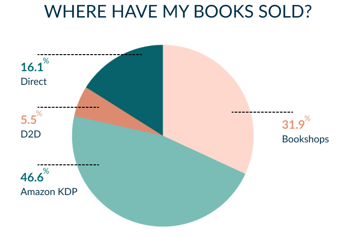 In 2025, most of the sales came from Amazon KDP (with 46.6%). I haven’t done as many in-person events at the bookshops, so it only made up for 31.9% of the sales. In third place, there’s the Direct sales, with 15.34%, and last but not least there’s Draft2Digital with 5.5%.